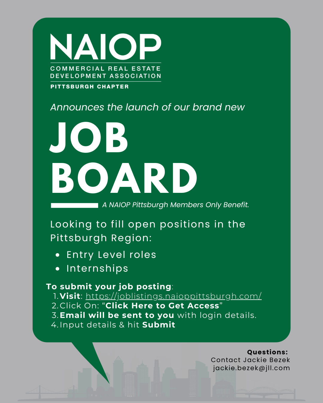 NAIOP Pittsburgh launched its Job Board to strengthen our commitment to developing both our members and the next generation of commercial real estate professionals. By connecting employers with emerging talent across the Pittsburgh region, the Job Board serves as a direct extension of our mission to educate, engage, and elevate the CRE community. Alongside initiatives like our Skyline Academy and our University Membership, the Job Board helps create clear pathways into the industry—supporting entry-level roles, internships, and long-term career growth within commercial real estate.