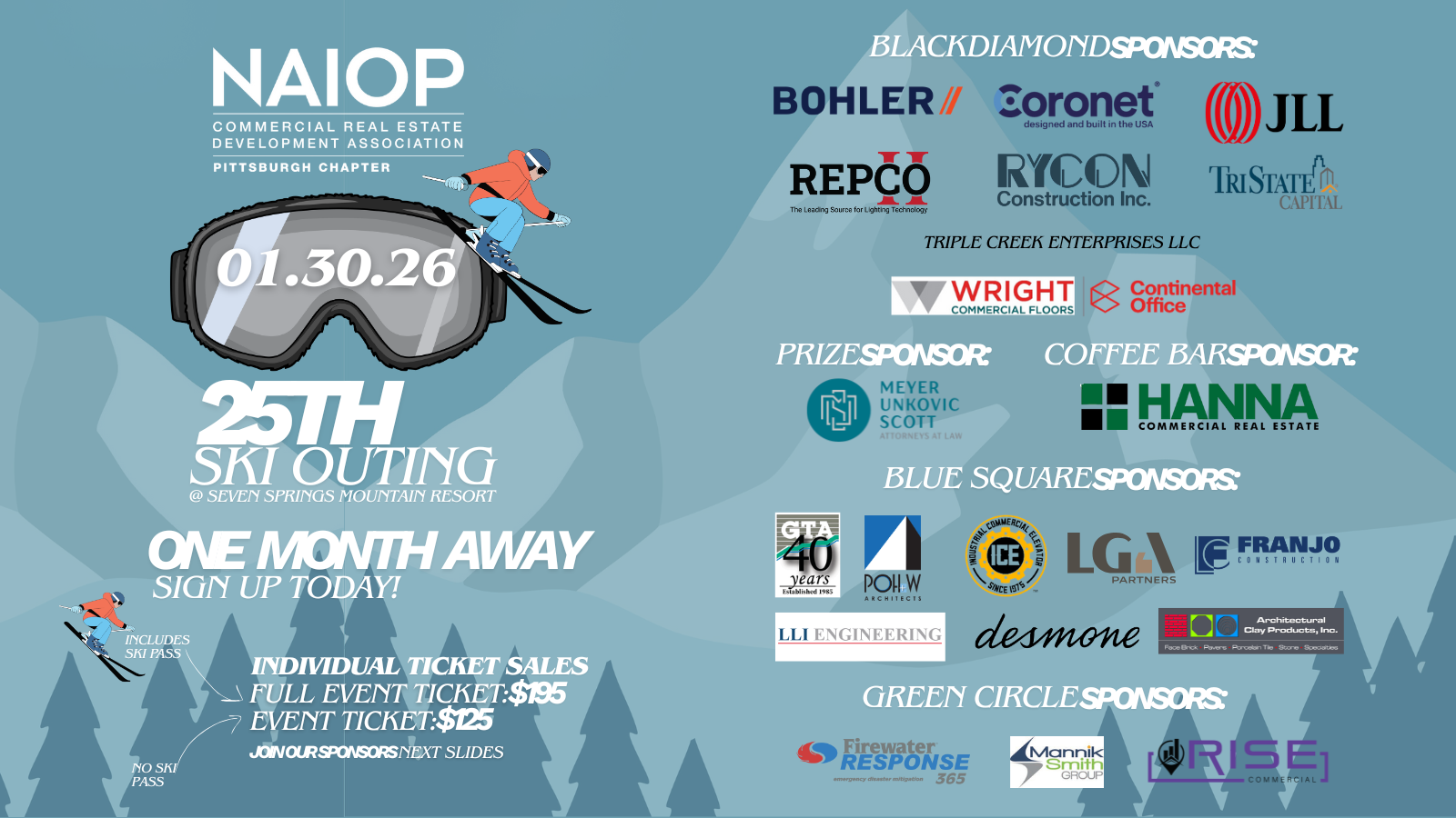 Secure your spot at our 25th Annual NAIOP Pittsburgh Ski Outing, on January 30, 2026. Interested in a sponsorship? Purchase today! Individual tickets to go on sale soon.
